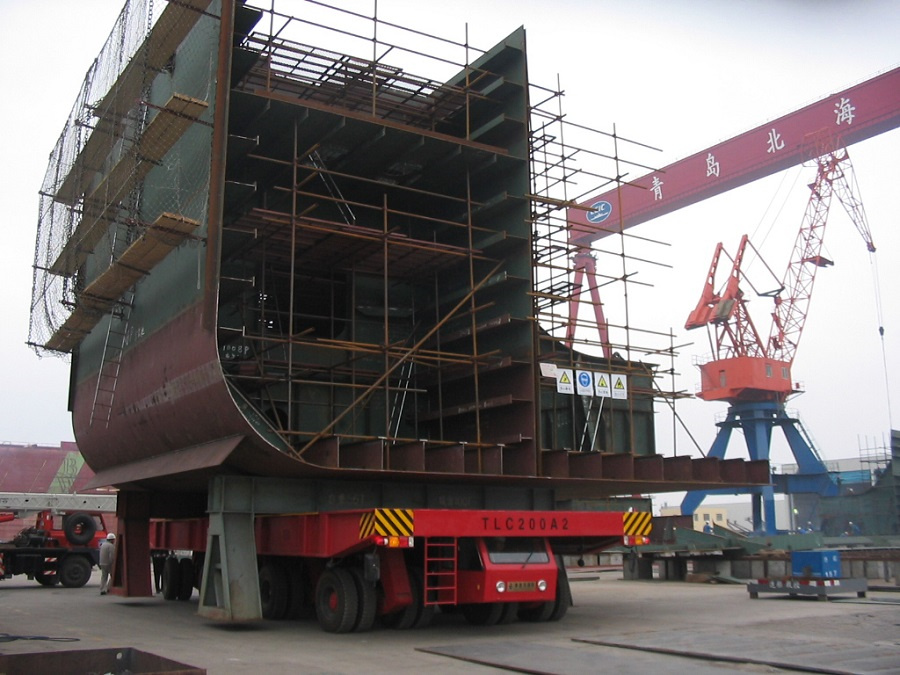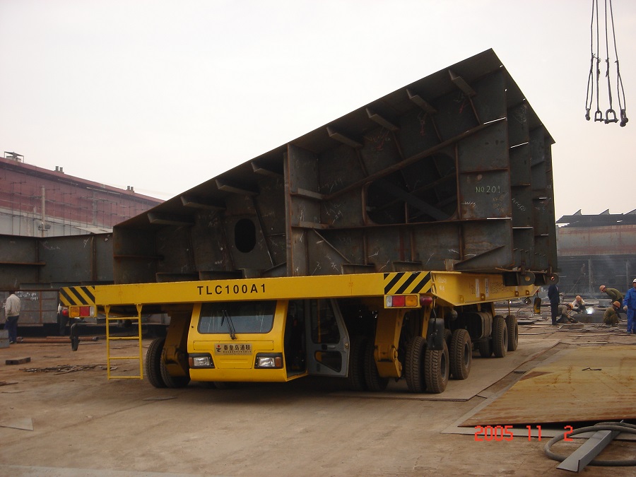 320T和500T液壓平板車拼車運(yùn)輸造船部件(韓國)